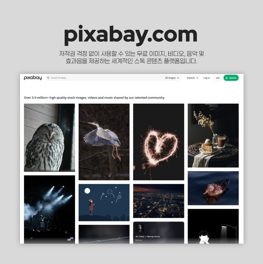 🔗픽사베이 (pixabay.com) 사진뿐만 아니라 벡터 그래픽, 일러스트, 동영상, 음악, 음향 효과(SFX), GIF까지 다운로드 가능한 플랫폼으로 가장 많이 사용되는 무료 이미지 사이트중 하나