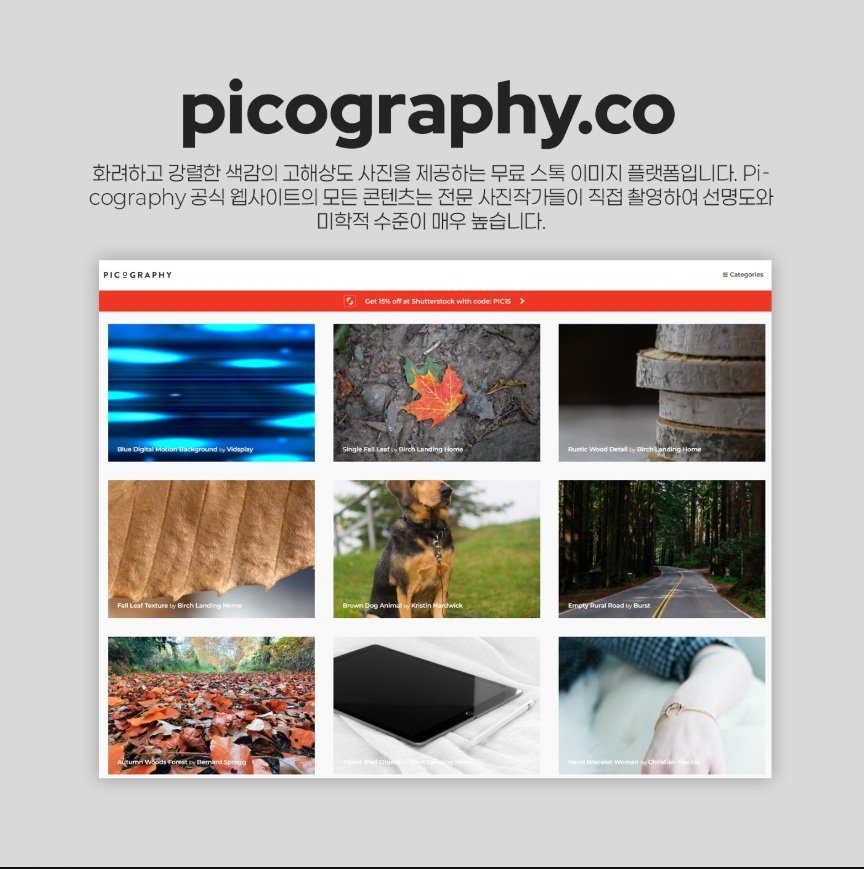 🔗픽점보 (picjumbo.com) 다양한 카테고리가 있어 워터마크가 없는 고해상도 이미지로 무료로 사용가능. 유료 프리미엄 멤버십으로 더 많은 독점 사진 컬렉션, 모든 무료 사진 일괄 다운로드 기능 등을 제공