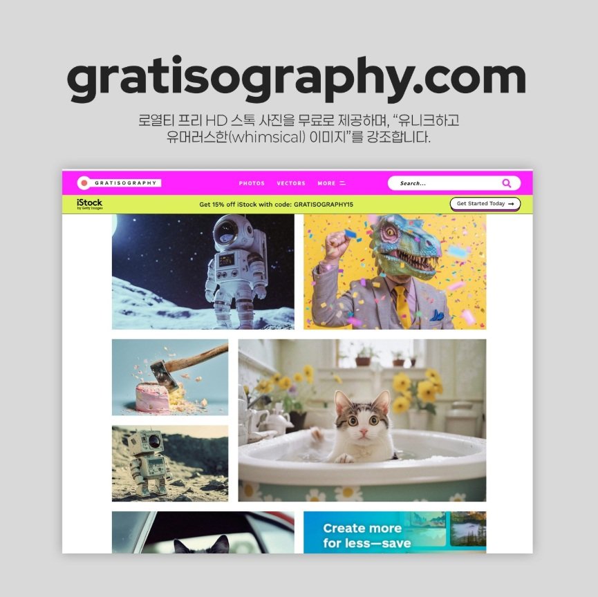 🔗그라티소그래피 (gratisography.com) 재미있고 독특한 초현실적인 컨셉을 전문으로 제공하는 무료 이미지 사이트. 사진뿐아니라 벡터이미지도 제공
